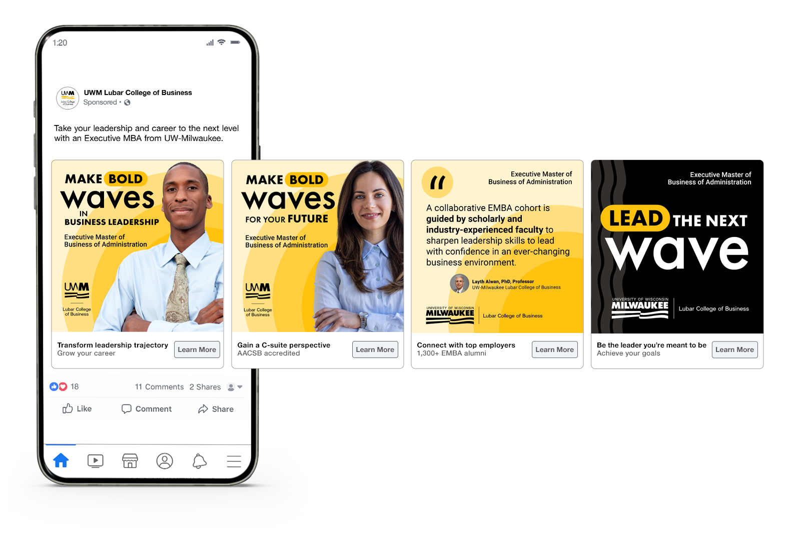 Leveraging UWM’s new "waves" visual identity, Vendi produced high-performing digital creative that spoke directly to professionals ready for their next move. By prioritizing lead quality over volume, Vendi established a framework for the college’s long-term enrollment growth, based on real-time data.
